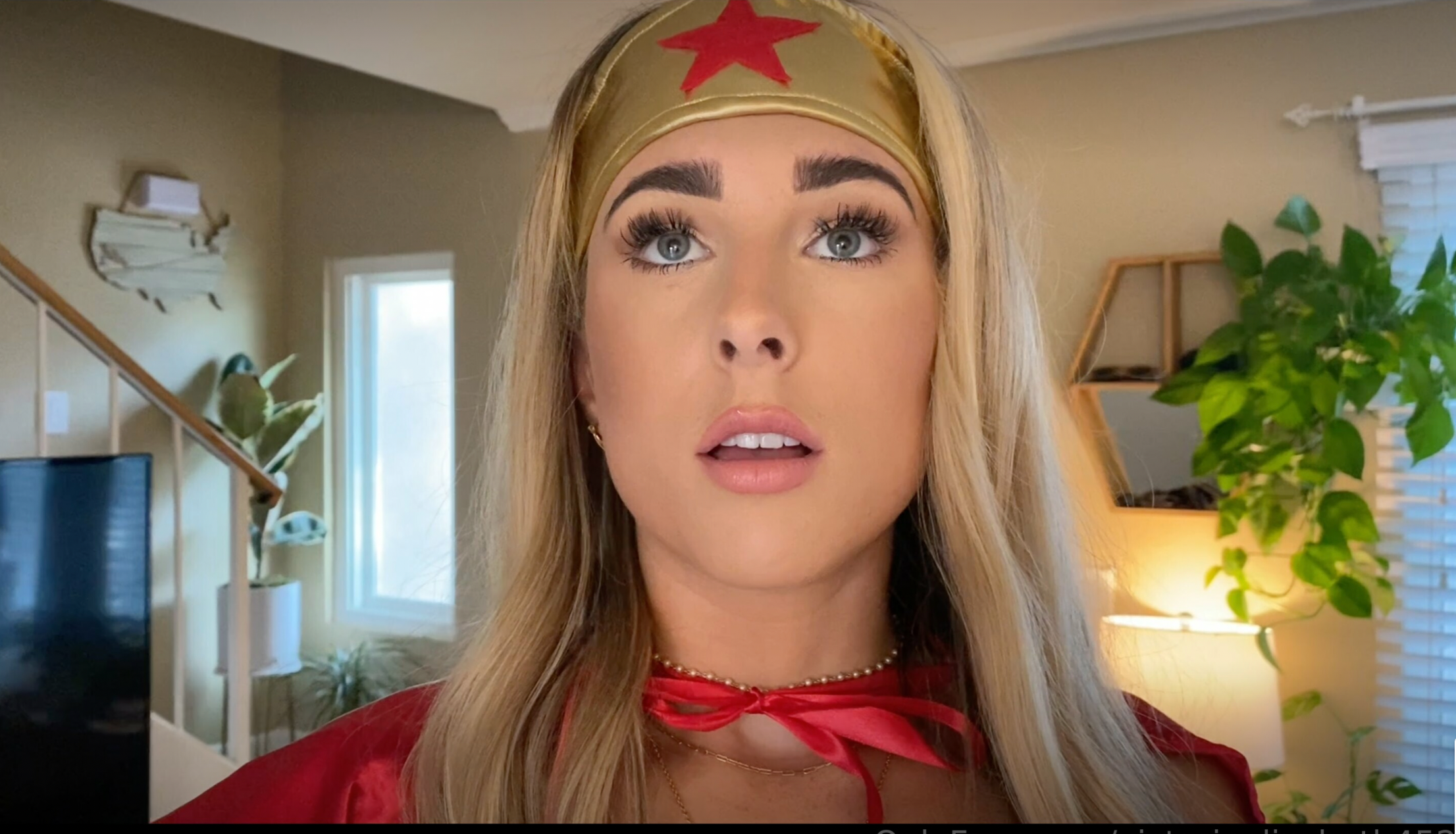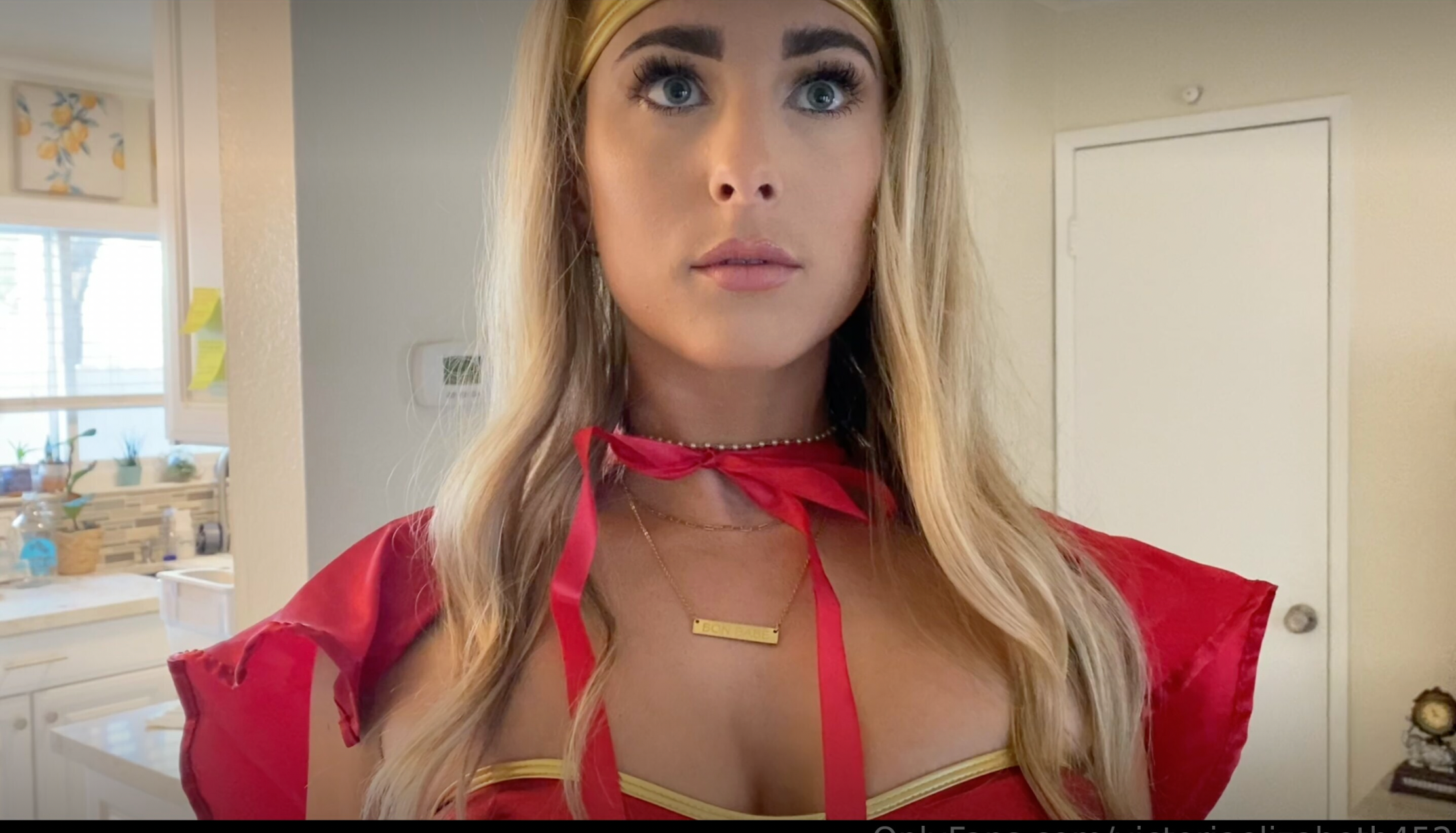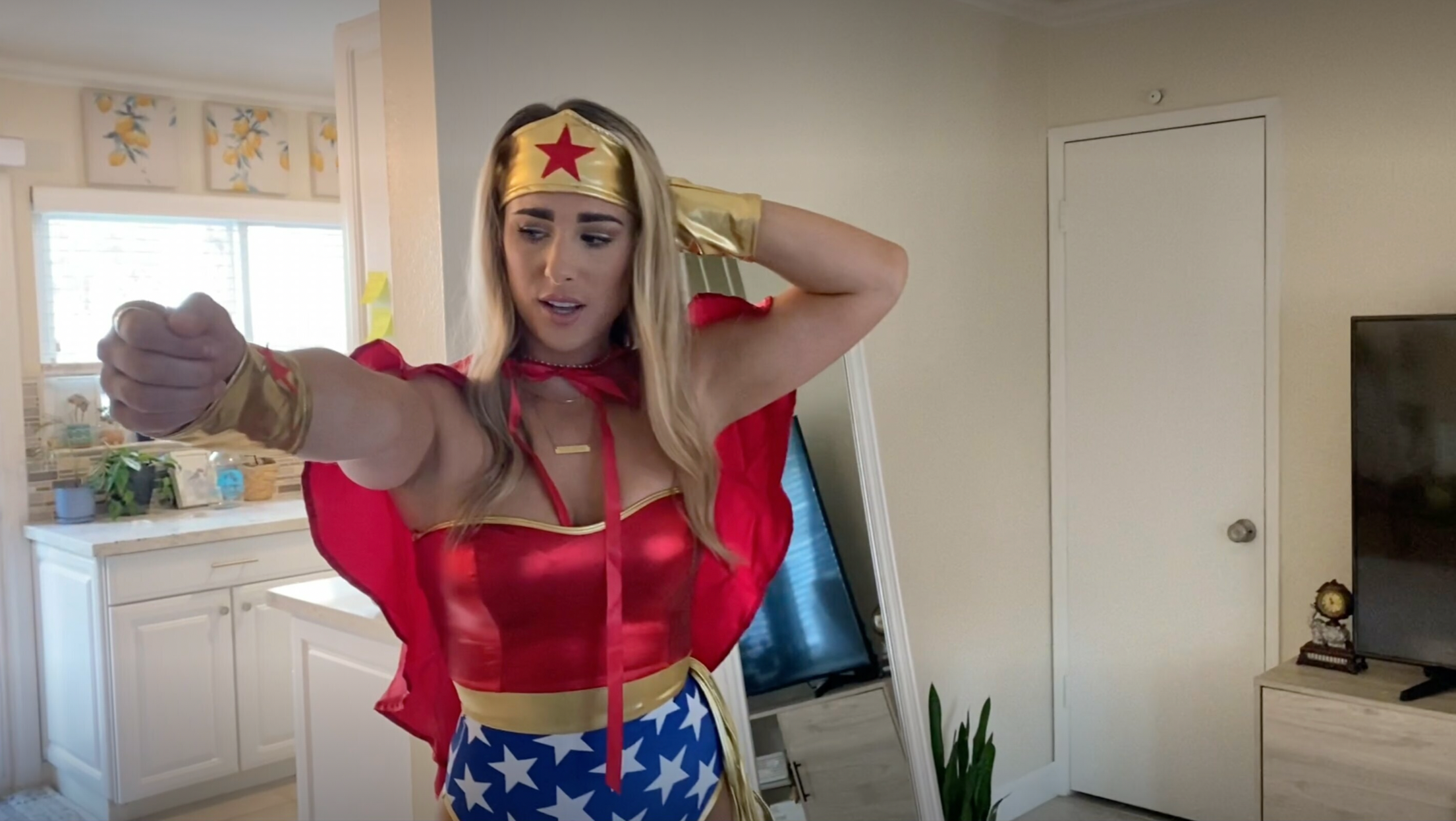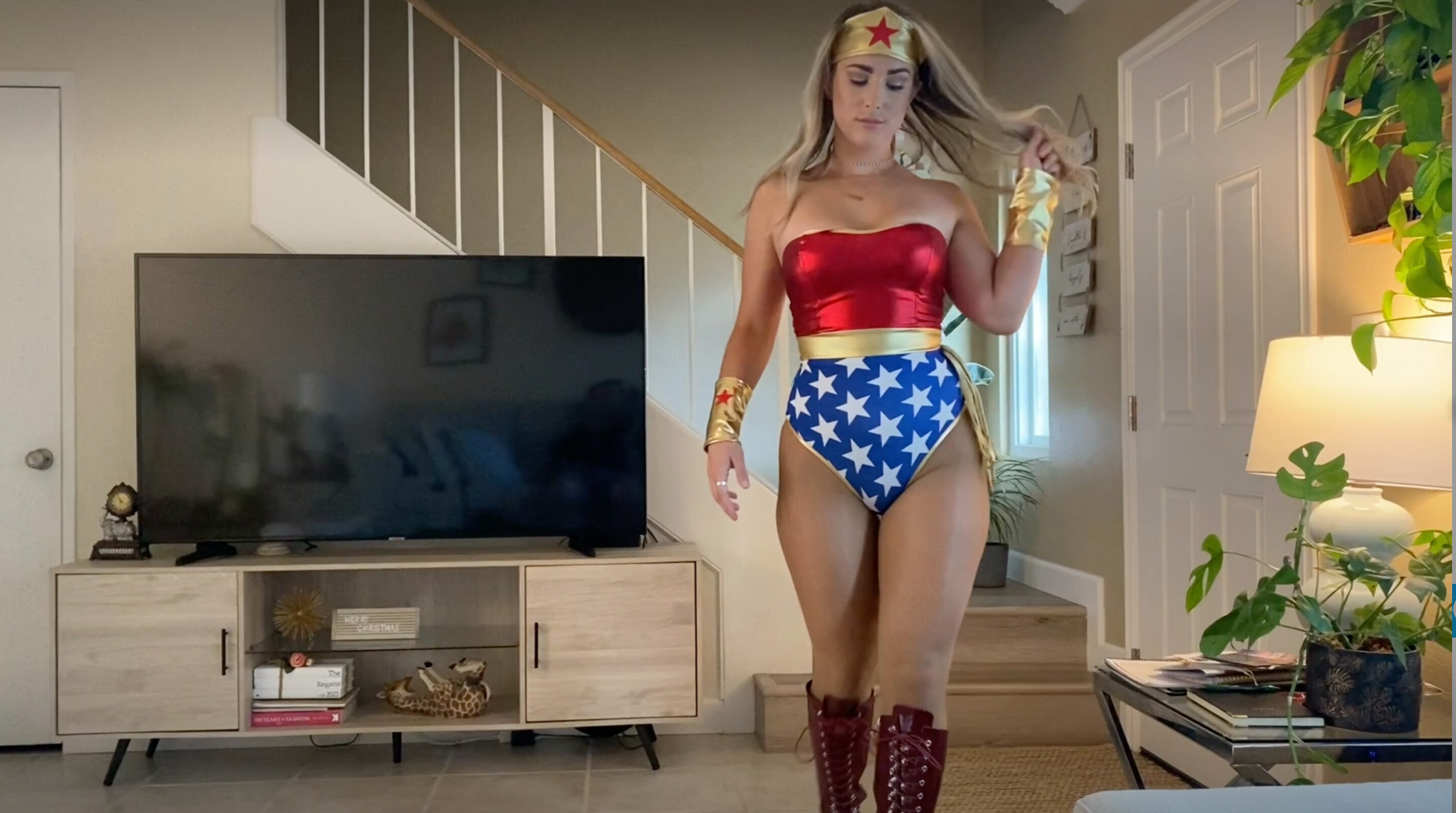 She’s stiff again and more scanning. Another click of the device and she starts dancing sexy, she takes her cape off and shakes her butt. She shakes her butt right in front of the camera. Lots of dancing before she gets close to the camera and says I want to be your slave forever while biting her lip and blinking her lashes all flirty.