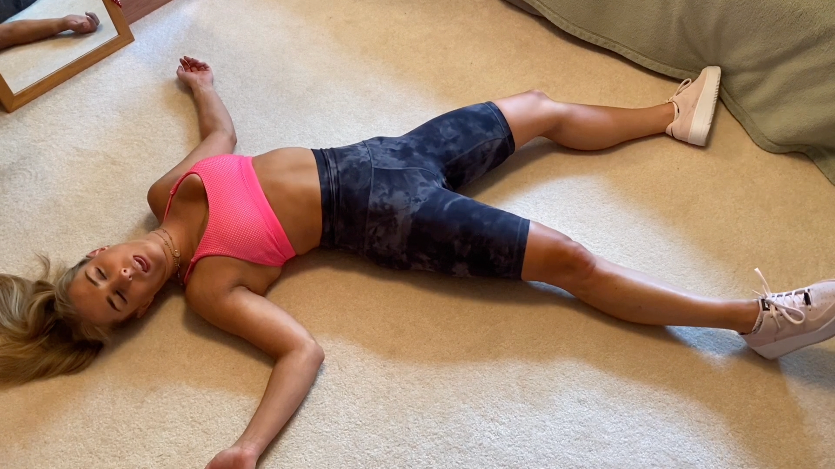 Victoria worked out too hard and is now really sleepy. She fumbles around her room falling to the floor, twitching and rolling her eyes a lot. She tries her best to make it to the bed to lay down but is too weak and falls around the room. She takes her shoes and socks off and shows off her feet. She falls to the ground with her butt in the air. Lots of angles are taken of her. Lots of scanning her body. She eventually makes it to the bed and passes out. More scanning of her body is done.