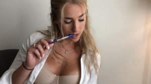 Victoria is a teacher and she sees her student is cheating on a test. She tells the student even though all the other teachers think he’s amazing and a super star student, she can see right through it. She rants at him for a bit, and says if he’s so great and smart then he can take the test again. She says she’ll make it worth his time… while she flirts and starts to play with the button on her blouse. He takes the test. While she’s grading it, the camera pans up and down her legs. He’s trying to touch her but she teases him and says she’s not done grading the test yet. He gets a few right and she unbuttons her shirt. As he gets more answers correct on the test she unbuttons more of her shirt. There’s some back and forth of him trying to touch her and her saying “no no she’s not done grading yet” very flirty. She eventually takes her blouse all the way off. She starts to shake her butt in front of him while she keeps grading. She starts to dance sexy around him. She checks the test again and after realizing he did very well she starts to give him a lap dance and let him grab her butt. Eventually after dancing around a bit, she allows him to take her bra off. She steps back to get a good view, then she leans in and says “let’s have some fun” fade to black.